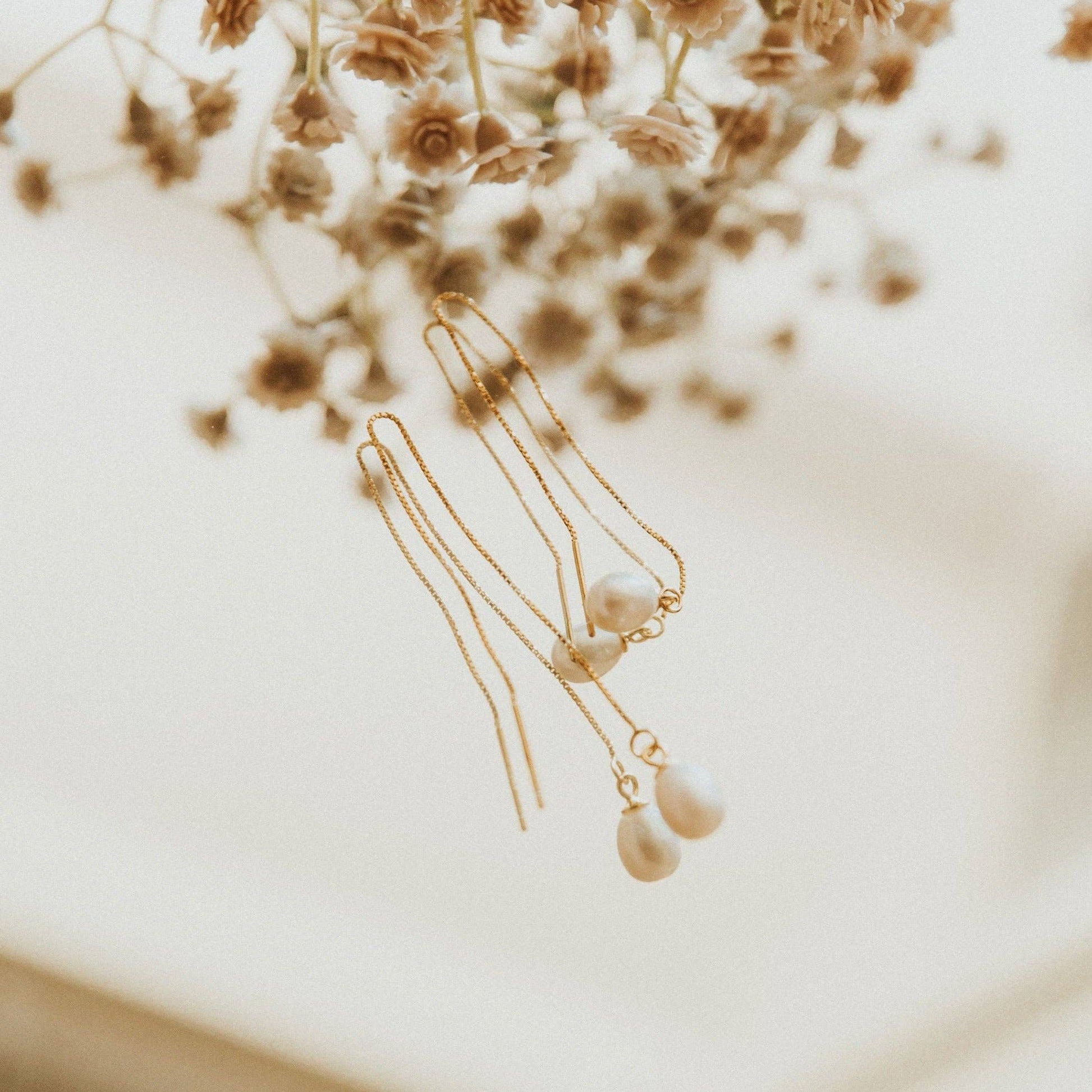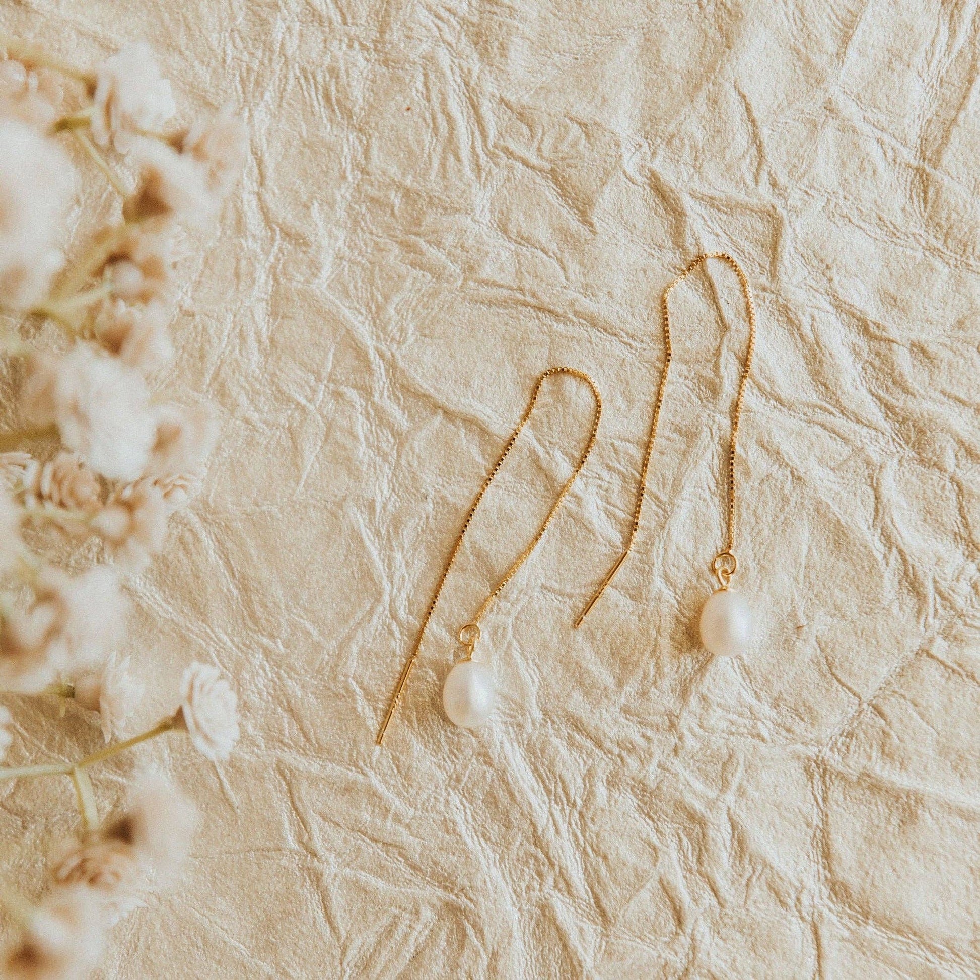 The Crystal Cove Pearl Threaders are this season's must have jewelry. Made of hypoallergenic gold vermeil (gold plated sterling silver), these earrings are wear and tarnish resistant and perfect with any outfit.